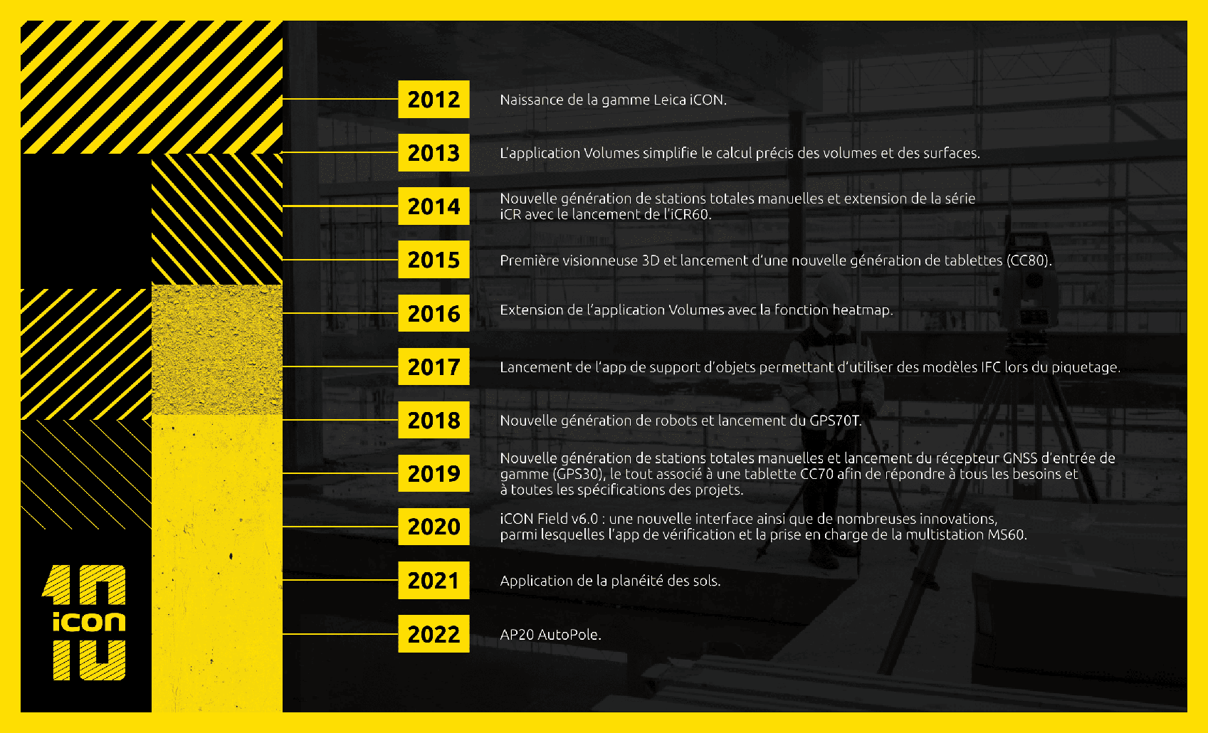- 2020 : iCON Field v6.0 : une nouvelle interface ainsi que de nombreuses innovations, parmi lesquelles l’app de vérification et la prise en charge de la multistation MS60.